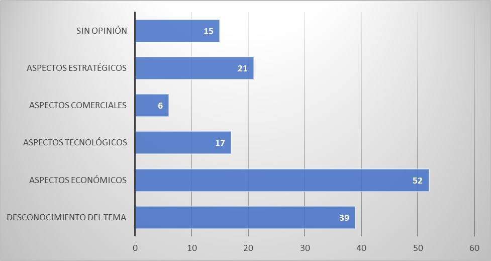 El gráfico muestra claramente que la respuesta “Aspectos económicos” fue la opción más seleccionada por los participantes de las MYPE, con un total de 52 respuestas. Esto respalda la hipótesis de que la falta de recursos económicos es un obstáculo principal para las MYPE salvadoreñas en su búsqueda de la transformación digital. Las otras opciones, como el desconocimiento del tema, también representan desafíos, pero en menor medida.