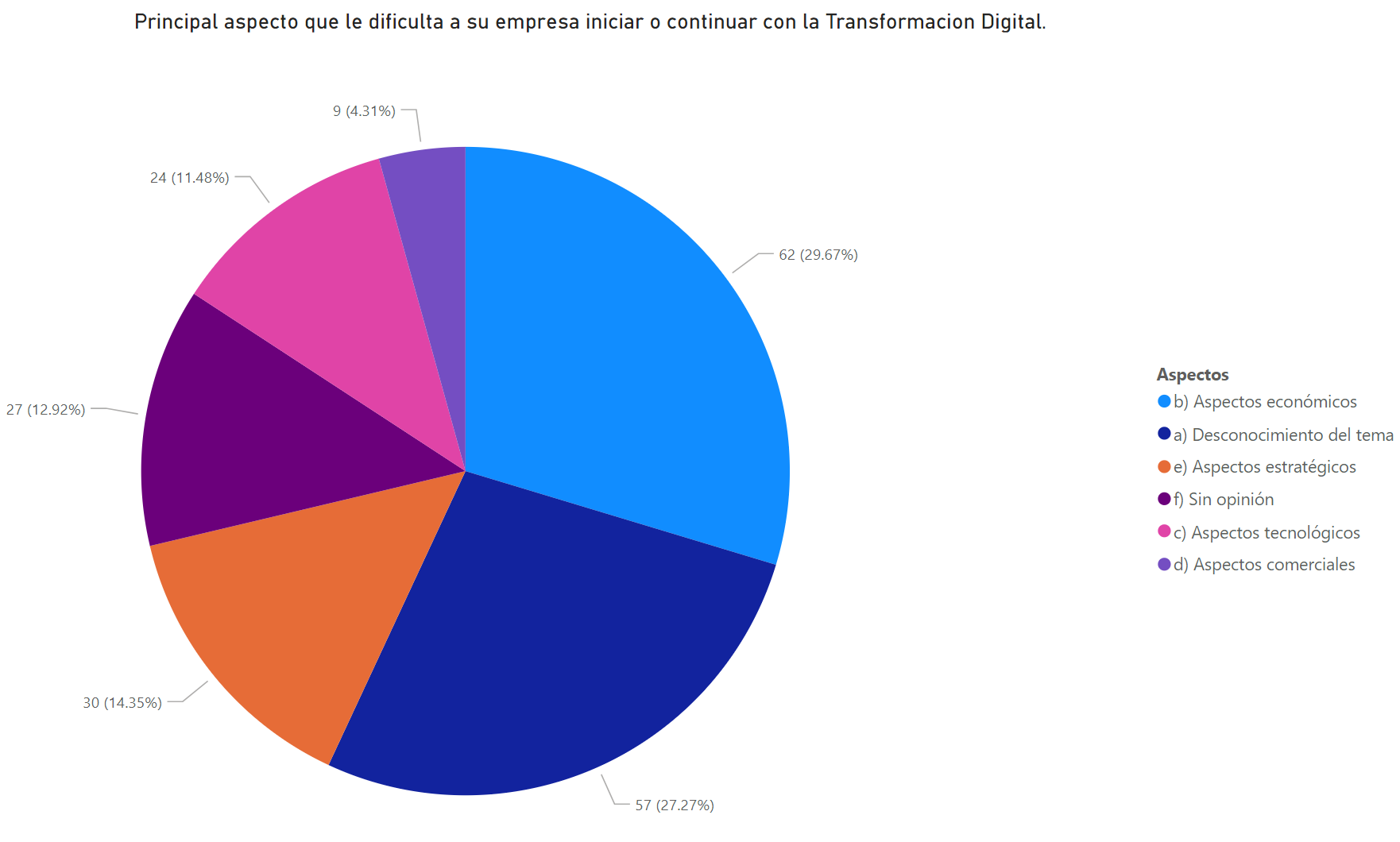 Asimismo, no todas las MYPES realizan procesos oficiales de registro y formalización, por lo cual muchas permanecen en la informalidad. Según una encuesta realizada recientemente por la Universidad Francisco Gavidia con una muestra de 209 personas de diversas áreas, se consultó ¿cuál consideraban era el principal aspecto que dificultaba a la empresa iniciar o continuar con la Transformación Digital? Quedando en primer lugar el aspecto económico, seguido después por desconocimiento del tema y aspectos estratégicos tal como se puede observar en la siguiente gráfica: