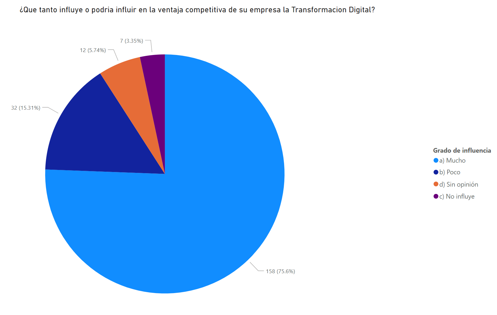 Adicionalmente, se indago para saber que tanto podría influir dentro de la ventaja competitiva de la compañía contar con un proceso de Transformación Digital, dando como resultado que el 75.6% tendría mucha influencia, es decir, están conscientes del beneficio que este le traería a la empresa, pero por los aspectos mencionados anteriormente no es viable ejecutarlo en el corto y mediano plazo.
