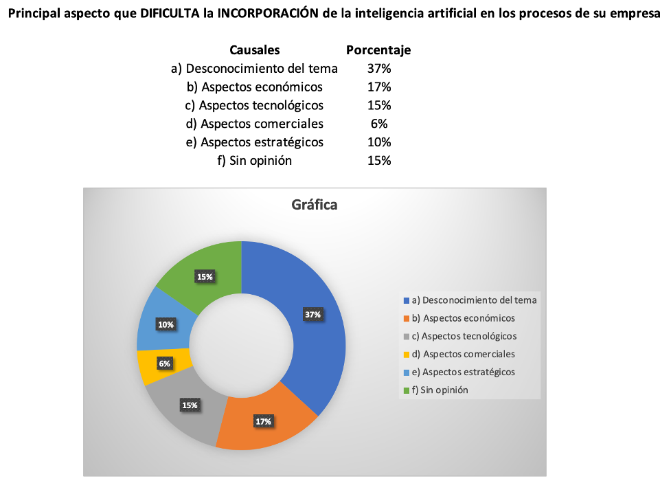 De acuerdo a la encuesta realizada, la principal dificultad para incorporar la IA es el desconocimiento del tema (37%), más que limitaciones económicas o tecnológicas. Esto resalta la necesidad de profundizar en la transformación digital de los procesos y el talento humano.