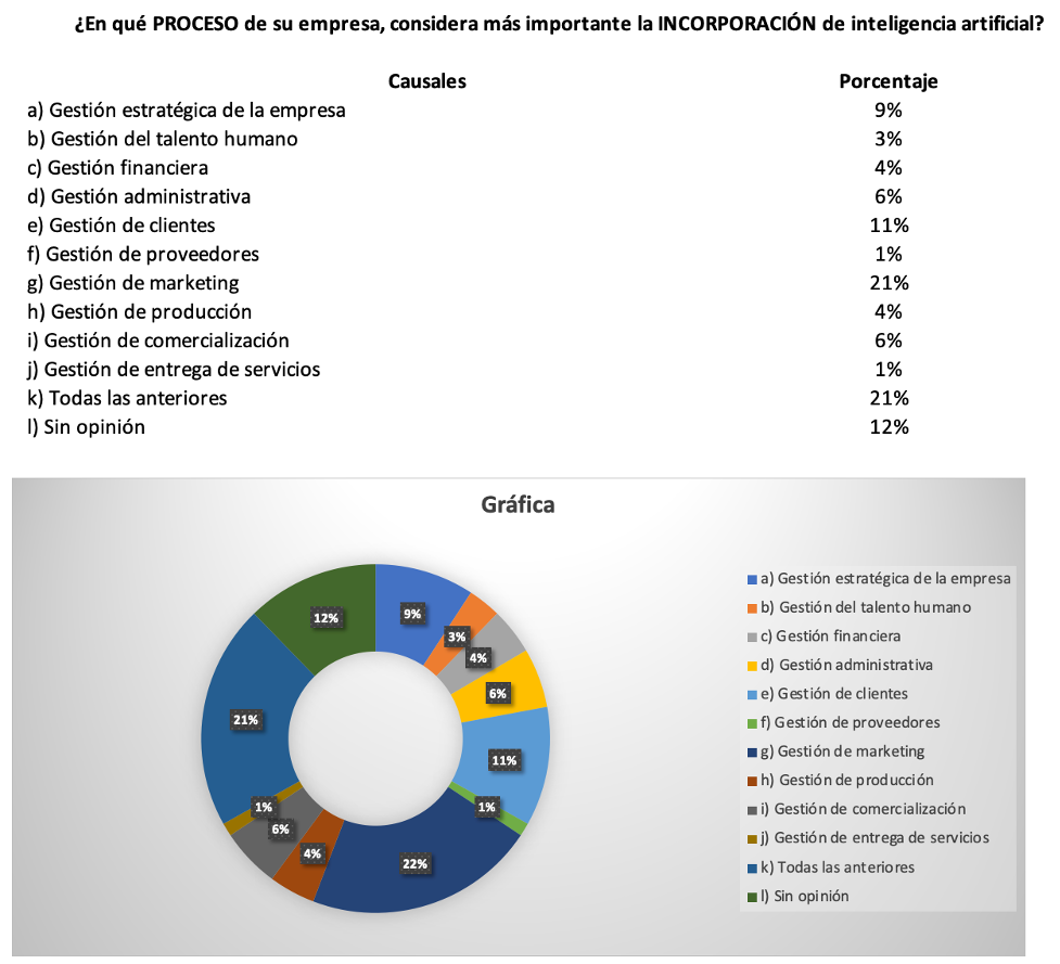 Otro dato relevante es que el 21% ve en el área de marketing y comercialización el mayor potencial para la IA, coincidiendo con la tendencia de expansión del comercio electrónico y la necesidad de entendimiento profundo del comportamiento de los clientes.